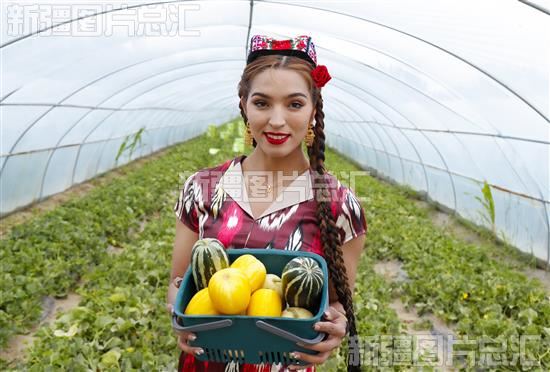 2023年9月1日,洛浦县纳瓦乡托万喀拉克尔村田间农场示范田,当地维吾尔族姑娘展示山东甜瓜。