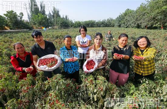 2023年9月15日,洛浦县布亚乡阿亚克昆孜村的村民展示刚采摘的朝天椒。