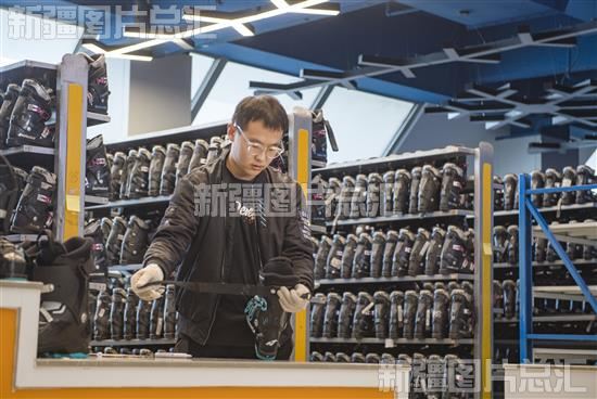 2023年11月26日,天山天池国际滑雪场,员工在整理滑雪鞋。
