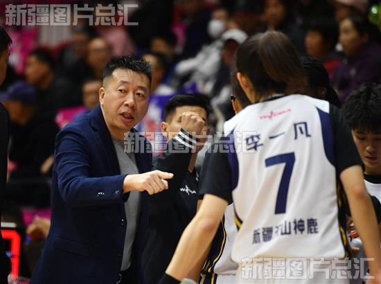 2023年11月25日,新疆天山女篮主教练贾楠现场布置战术。