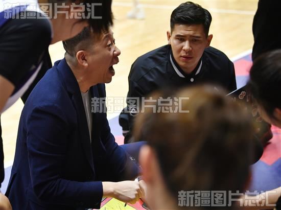 2023年11月25日,新疆天山女篮主教练贾楠现场布置战术。
