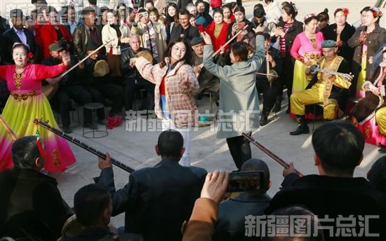 2023年11月24日,库车市牙哈镇的民间艺人和群众一起跳麦西热甫。