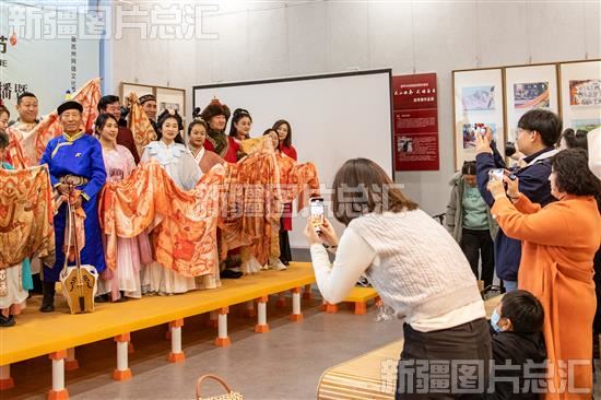 2023年11月27日,参演人员在位于吉木萨尔县北庭镇的丝绸之路北庭故城遗址博物馆向观众展示“王者出行图”文创产品。