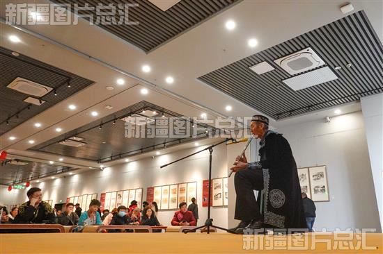 2023年11月27日,民间艺人在位于吉木萨尔县北庭镇的丝绸之路北庭故城遗址博物馆演奏哈萨克族传统乐器斯布孜额。