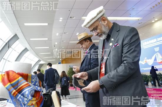 2023年11月24日,参加上海合作组织2023旅游年论坛的嘉宾,在新疆国际会展中心被各类别具一格的文创产品吸引。