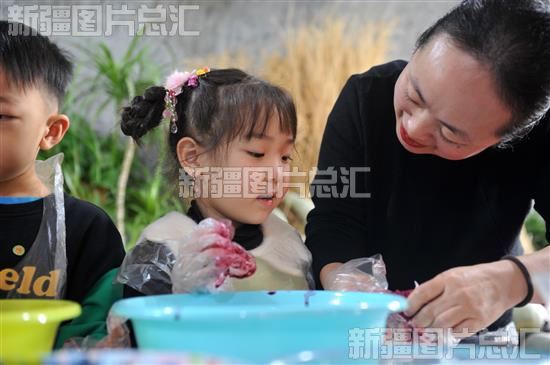 2023年11月28日,小朋友在天山村六亩半手作文创园体验植物印染。