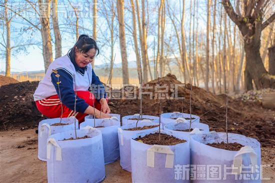 2023年11月30日,新源县林业和草原局苗圃工作人员将野果树幼苗移栽到美植袋中进行培育。
