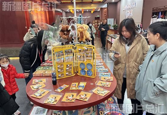 2023年12月3日,游客在巴音郭楞蒙古自治州博物馆文创展位参观。