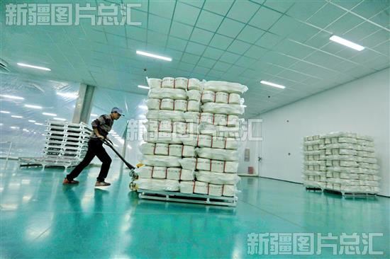 2023年12月4日,在库车利华纺织有限公司四分厂棉纺加工车间工人在装运包装好的棉产品。