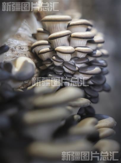 新源县别斯托别乡食用菌大棚基地种植的平菇长势喜人(2023年11月28日摄)。