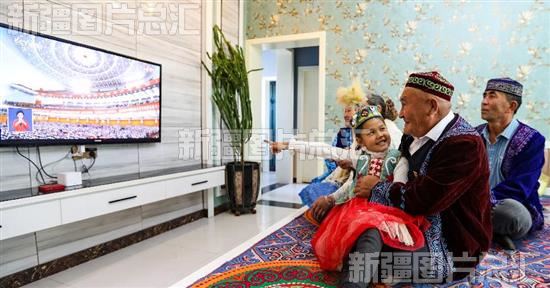 2022年10月16日,呼图壁县雀尔沟镇南山牧村老党员阿力德克·沙哈巴一家通过电视收看中国共产党第二十次全国代表大会开幕会盛况。王俊伟摄