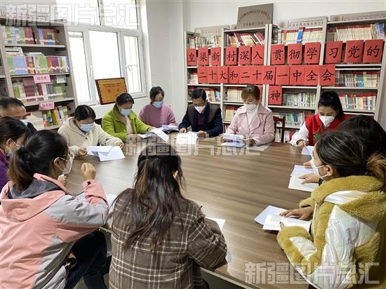 2022年10月26日,沙湾市第三小学驻柳毛湾镇皇渠新村“访惠聚”工作队队员和村干部一起在农家书屋学习党的二十大精神。