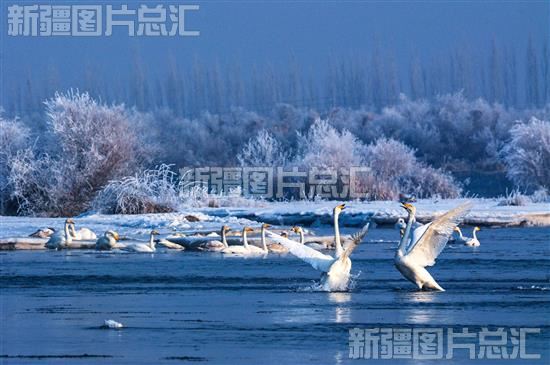 位于新疆生产建设兵团第二师铁门关市的开都河天鹅湾,天鹅在水中“引吭高歌”(2022年1月17日摄)。近年来,当地不断加大生态保护力度,沿河湿地成为各种鸟类的理想栖息繁衍地。韩峻摄