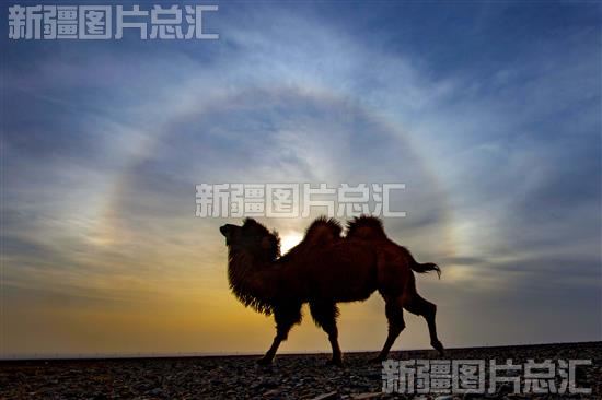 2022年3月9日拍摄的日晕映驼峰景观。当日,哈密北部的戈壁上空出现日晕天象,戈壁上悠闲觅食的骆驼身影和日晕天象相映成趣,构成一道独特的景观。 蔡增乐摄