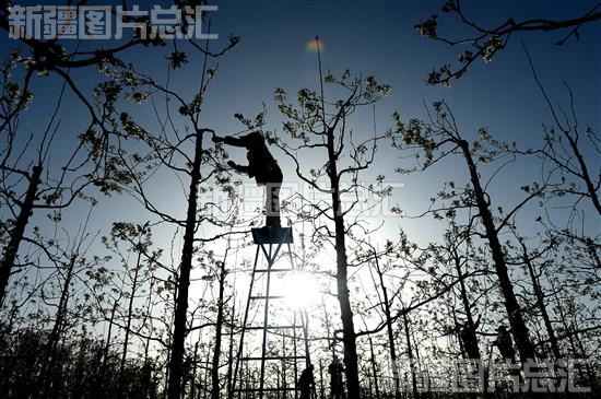 2022年4月8日,兵团第一师14团职工在香梨园为梨花授粉。进入四月,塔里木垦区气温迅速升高,各种花卉竞相绽放,果农们抢抓农时,为果树授粉,确保稳产增收。王志清摄