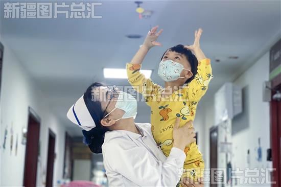 2022年4月30日,乌鲁木齐市米东区中医医院护士陪小患者做游戏。“五一”假期,该医院医护人员坚守在岗位,为群众健康保驾护航。孙振嵩摄