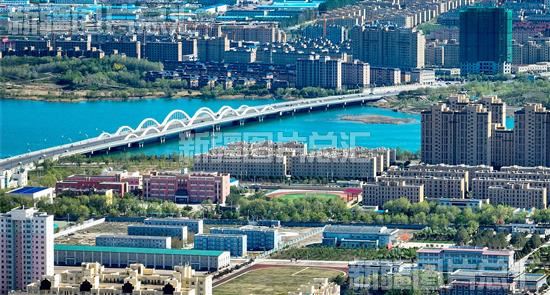 俯瞰博乐市区,远处为博尔塔拉大桥(2022年5月6日无人机拍摄)。近年来,博乐市践行绿化为民、绿化惠民目标,多措并举努力打造绿城博乐,收效显著。夏特克·海拉提摄
