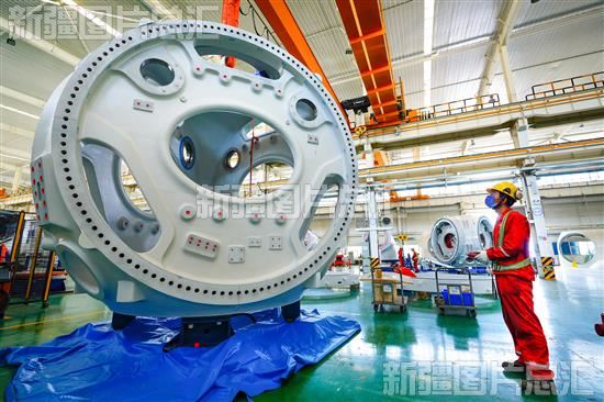 2022年5月30日,工人在位于哈密市伊州区的哈密金风风电设备有限公司生产车间吊装风机轮毂。截至第一季度末,该公司累计实现全球装机8761.23万千瓦,累计全球装机数量达到45186台。李华 摄
