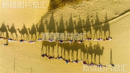 2022年8月4日,游客骑骆驼在尉犁县罗布人村寨景区游览,感受大漠风情(无人机摄)。李飞摄
