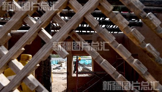 2023年4月25日,工匠在库车市老城热斯坦历史文化街区帕哈塔巴扎巷老屋修缮保护现场施工。自库车市启动“拯救老屋行动”以来,该市从北京聘请技术专家现场指导,培训当地传统工匠,为历史文化城保护提供保障。 周鹏摄