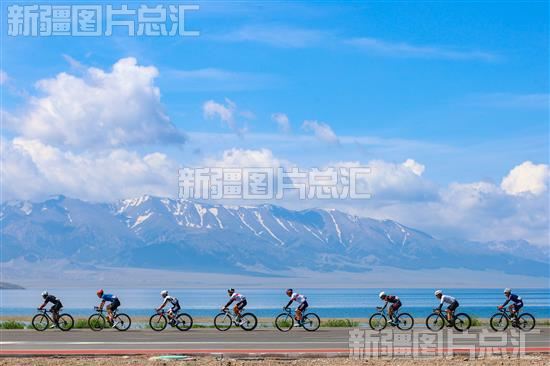 2023年6月15日,参赛选手在赛里木湖景区奋力骑行。当日,中国新疆第十五届“天莱香牛杯”环赛里木湖公路自行车赛迎来最后一个赛段的比赛。韩亮摄