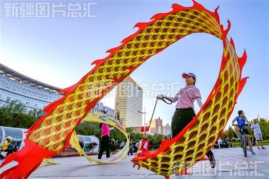 2023年7月3日,市民在乌鲁木齐南湖市民广场舞动彩带龙。夏日的南湖市民广场碧水蓝天,绿草如茵,每到傍晚,很多市民便会在此唱歌跳舞,休闲纳凉,享受夏日时光。蔡增乐摄