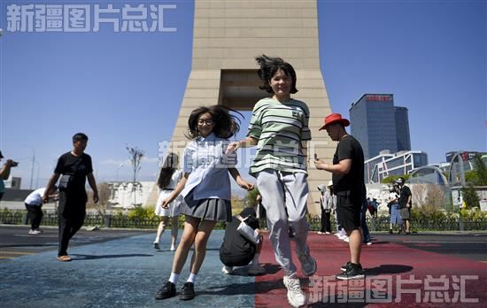 2023年7月28日,游客在中哈霍尔果斯国际边境合作中心中哈两国连接通道上体验“一步跨两国”的奇妙感受。进入7月,中哈霍尔果斯国际边境合作中心迎来边境游、跨境游、购物游客流高峰。汤永摄
