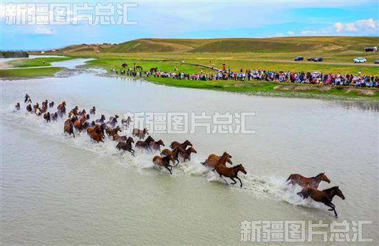 2023年8月6日,游客在观看“天马浴河”表演。每年6月开始,当地牧民都会在特克斯河举行“天马浴河”表演,吸引众多游客前来观看拍摄。张庆华摄