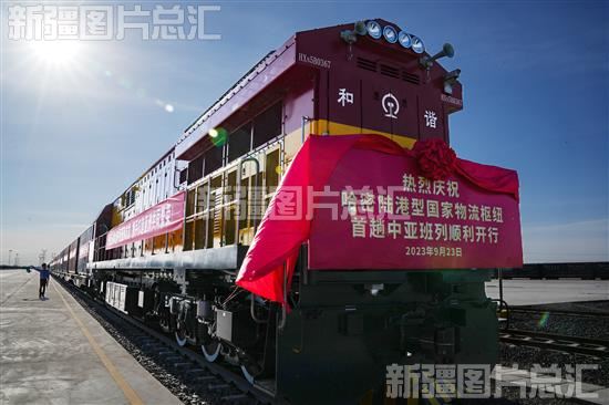 2023年9月23日。哈密陆港型国家物流枢纽首趟中亚班列顺利开行。当日,哈密陆港型国家物流枢纽揭牌,哈密陆港中心正式运营开通。普拉提·尼亚孜摄