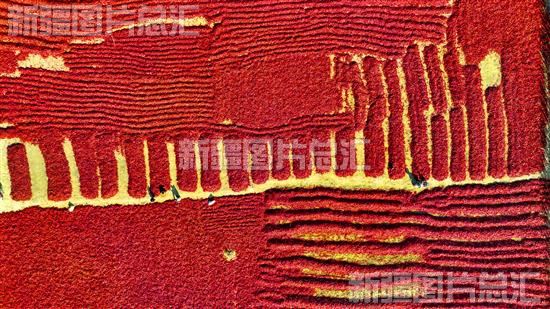 2023年10月12日,俯瞰博湖县乌兰再格森乡的辣椒晒场(无人机摄)。眼下,博湖县6万余亩色素辣椒迎来丰收季,红彤彤的辣椒铺满晒场,形成一片红色“海洋”。年磊摄