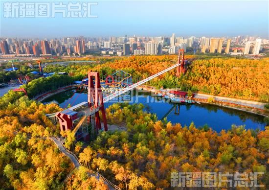 2023年10月23日,俯瞰库尔勒市龙山公园。为改善城市周边生态环境,库尔勒市对城市周边荒山进行绿化,截至目前已完成荒山绿化面积约10万亩,在城市外围初步构筑起了一道绿色屏障。确·胡热摄