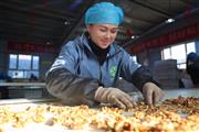 2023年12月7日,合作社社员在核桃加工车间分拣核桃仁。