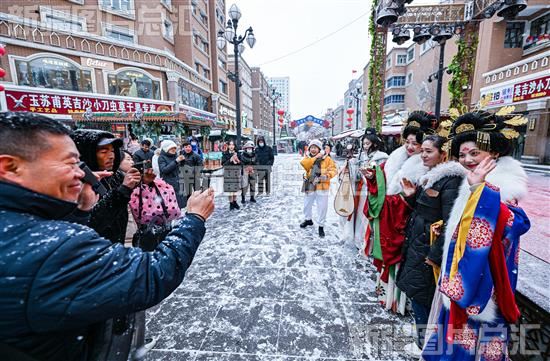 2023年12月9日,在新疆国际大巴扎景区步行街游客和演员合影留念。
