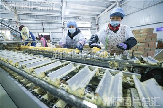 2023年12月6日,工人在位于博乐市小营盘镇铁日木布拉格村的新疆漠上行食品有限公司车间生产鲜食玉米。