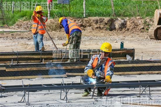 2022年6月15日,施工人员在呼图壁县呼雀路X146线改建工程施工现场焊接混凝土预制T梁底座。