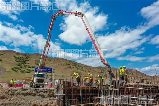 2022年6月15日,施工人员在呼图壁县呼雀路X146线改建工程施工现场浇筑桥身混凝土。