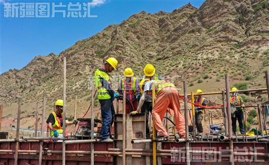 2022年6月15日,施工人员在呼图壁县呼雀路X146线改建工程施工现场浇筑桥身混凝土。