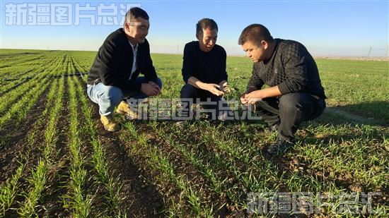 2023年11月1日,察布查尔锡伯自治县农业农村局驻加尕斯台镇巴合提村工作队队员和村民在冬小麦种植基地里查看小麦长势。?
