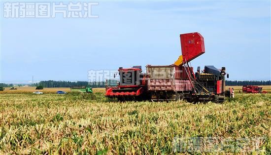 2023年9月11日,在察布查尔锡伯自治县爱新色里镇纳旦芒坎村制种玉米基地,收割机和运粮车在田野里来往穿梭,收获新粮。