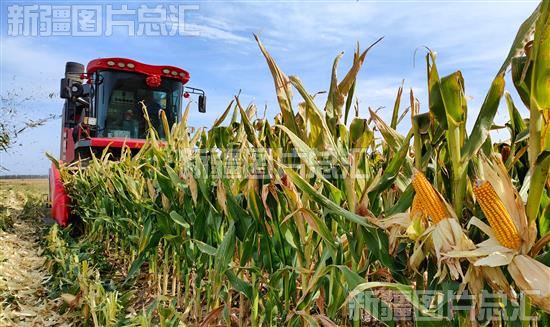 2023年9月11日,在察布查尔锡伯自治县爱新色里镇纳旦芒坎村制种玉米基地,收割机和运粮车在田野里来往穿梭,收获新粮。
