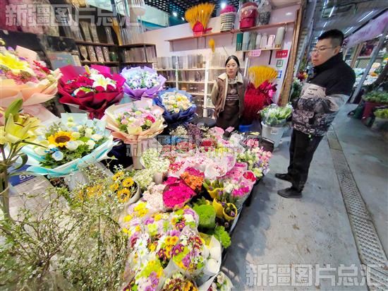 2023年12月16日,市民在位于乌鲁木齐高新区(新市区)的新联农副产品综合市场选购鲜切花,该市场内各类蔬菜、水果、肉类、粮油等商品供应充足,价格稳定。