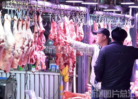 2023年12月16日,市民在位于乌鲁木齐高新区(新市区)的新联农副产品综合市场选购新鲜牛羊肉,该市场内各类蔬菜、水果、肉类、粮油等商品供应充足,价格稳定。