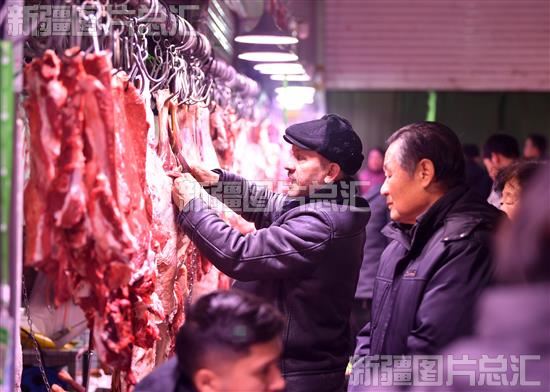 2023年12月16日,市民在位于乌鲁木齐高新区(新市区)的新联农副产品综合市场选购新鲜牛羊肉,该市场内各类蔬菜、水果、肉类、粮油等商品供应充足,价格稳定。