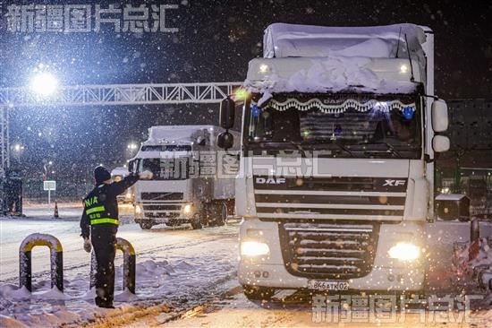 2023年12月12日晚,民警引导出境车辆有序通关。 连日来,受强冷空气影响,霍尔果斯气温降至零下20摄氏度,能见度不足10米,给出入境通关车辆带来了较大影响,新疆出入境边防检查总站霍尔果斯出入境边防检查站以“雪”为令,闻“雪”而动,第一时间启动恶劣气候勤务保障应急预案,确保恶劣天气下口岸通关安全顺畅。卢斌摄