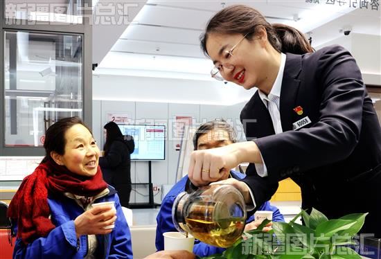 2023年12月13日,中国银行昌吉市中山路支行中银公益驿站,工作人员为歇脚取暖的环卫工人和快递员送上热茶。连日来,昌吉市迎来降雪寒潮天气,各街道社区纷纷向企业、商铺发起倡议,为执勤交警、环卫工人、快递员和过往行人提供“歇脚、取暖、热水”等暖心服务,为户外工作者和市民送上寒冬里浓浓的暖意。梁宏涛摄
