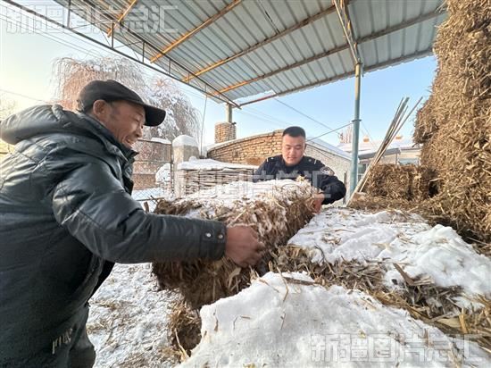 2023年12月13日,新疆出入境边防检查总站伊犁边境管理支队可克达拉边境派出所党员民警服务队,深入新疆生产建设兵团第四师64团5连,帮助群众做好牲畜饲草料储备和防寒工作。王鹏飞摄