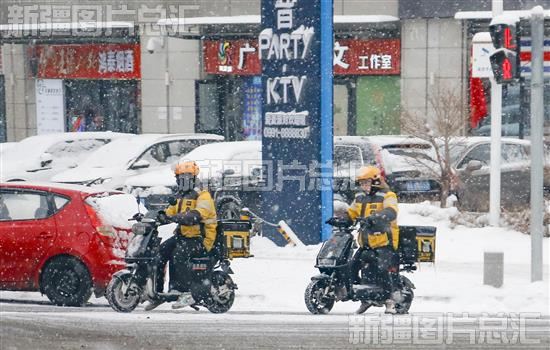 2023年12月12日,外卖员在乌鲁木齐经济技术开发区(头屯河区)万达商圈冒雪配送外卖。近期,乌市迎来降雪降温天气,外卖小哥们无惧风雪和寒冷,奔波在大街小巷,将餐食等大众所需送到位。石榴云/新疆日报记者 谢龙摄