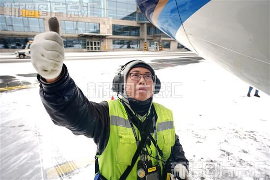 2023年12月13日13时,在乌鲁木齐地窝堡国际机场的停机坪上,南航新疆分公司一名机务维修人员用手势示意机组:地面所有操作已就绪。 石榴云/新疆日报记者 张万德摄