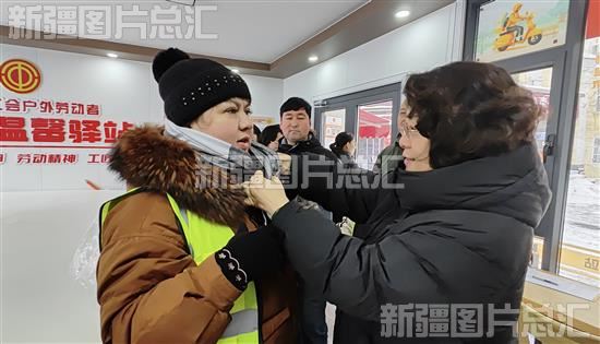 2023年12月13日,乌鲁木齐市沙依巴克区总工会主席张慧正为环卫工戴围巾。石榴云/新疆日报记者孙芳婷 摄