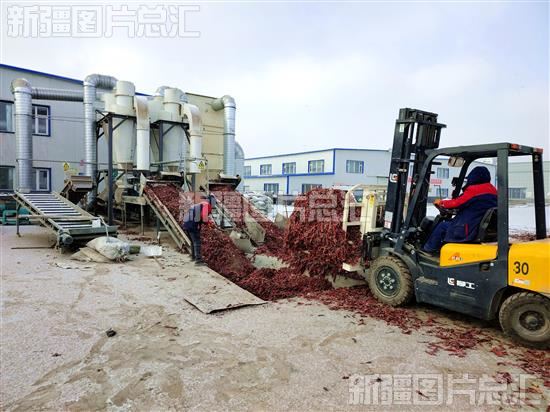 2023年12月15日,位于铁门关经济技术开发区绿源产业园的新疆天椒红冠食品有限公司辣椒烘干车间,工人正在生产线上忙碌作业。